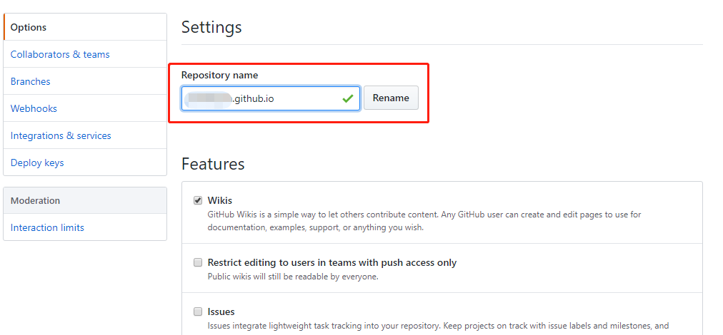 点击 Settings 按钮打开设置页面,重命名项目名称为:github_username.github.io。