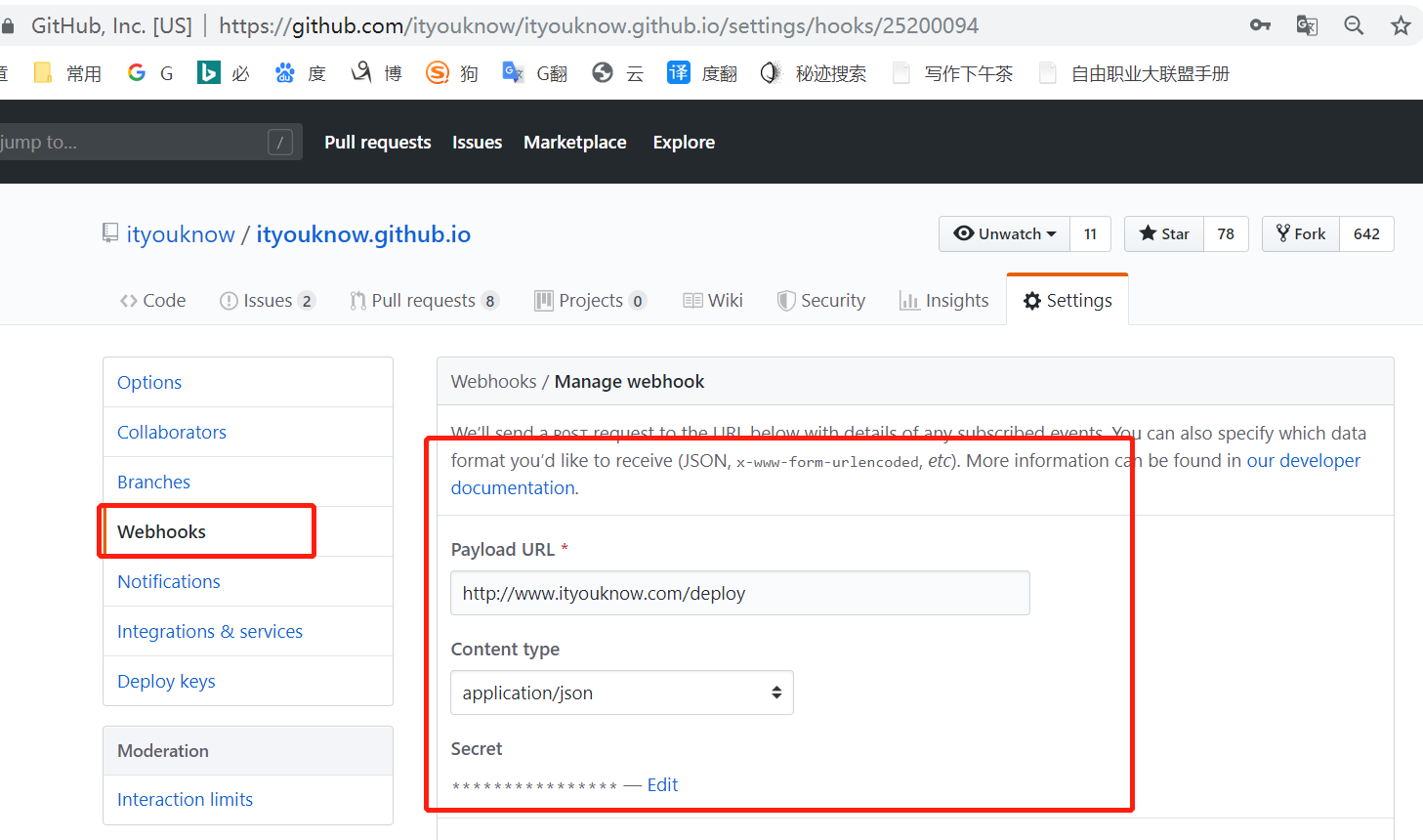 var handler = createHandler({ path: '/deploy', secret: 'ityouknow' }) //监听请求路径,和Github 配置的密码